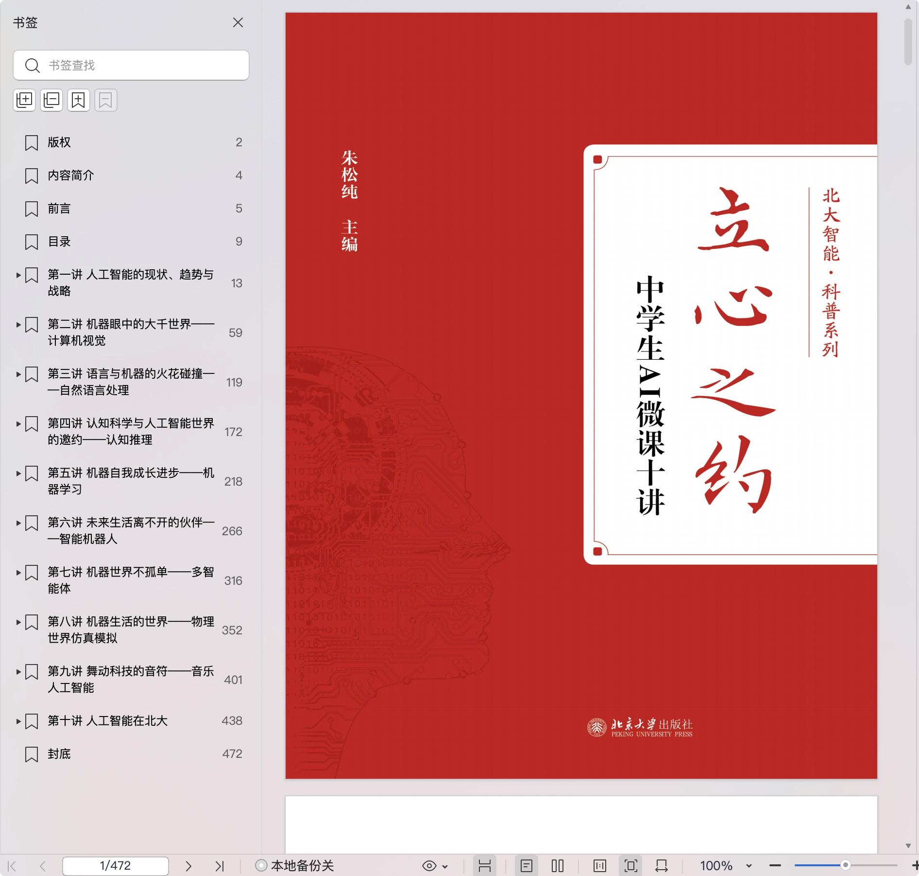 《立心之约——中学生AI微课十讲》由朱松纯主编,北京大学出版社于2025年1月出版。该书基于2023年北京大学智能学院、人工智能研究院等机构推出的同名网络课程改编,该课程累计播放量逾千万次,并于2024年入选教育部"名师教AI"专栏。朱松纯现任北京通用人工智能研究院院长、北京大学讲席教授,曾获国际计算机视觉大会马尔奖等荣誉