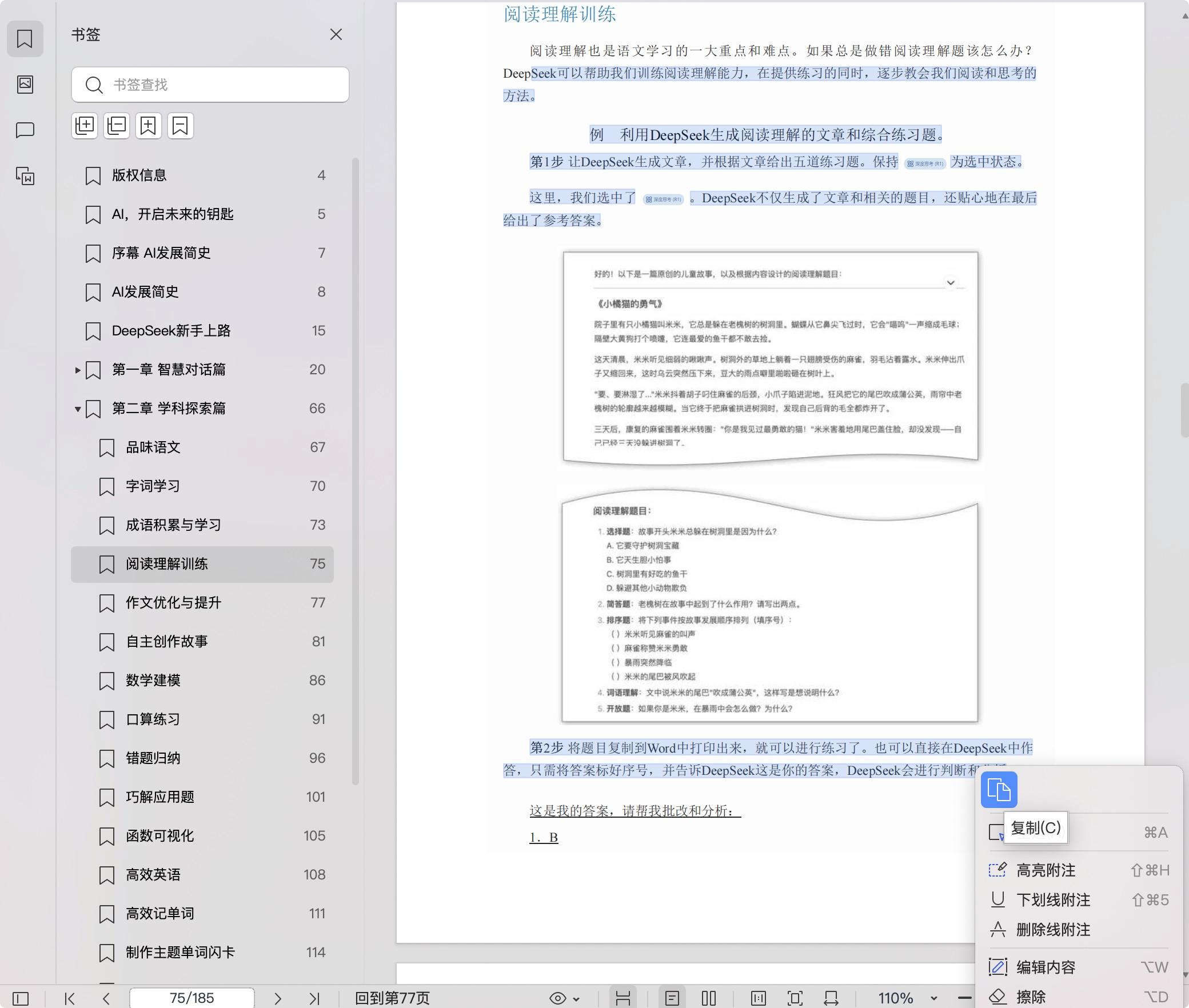 换位思考能帮助我们从不同角度去看待和分析问题,在使用 DeepSeek 时也是如此。“角色扮演法”可以赋予 DeepSeek 不 同的身份,让它的回答更加精准,也能让它的语气、回答方式、 口吻更加符合用户的预期。 例1 以小学老师的口吻来解释什么是人工智能。 首先,我们来看看 DeepSeek 在正常情况下是如何回答的。 输入指令: 什么是人工智能? (图) 这样的回答很专业,但同学们却不一定能看懂。 现在,我们可以使用“角色扮演法”来调整一下提问的方式, 使 DeepSeek 的回答更符合学生的阅读和理解视角。