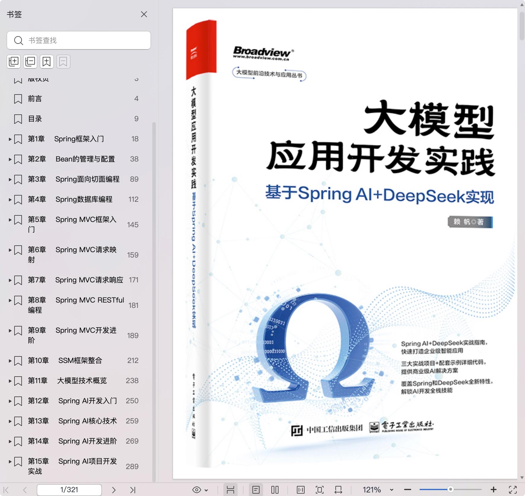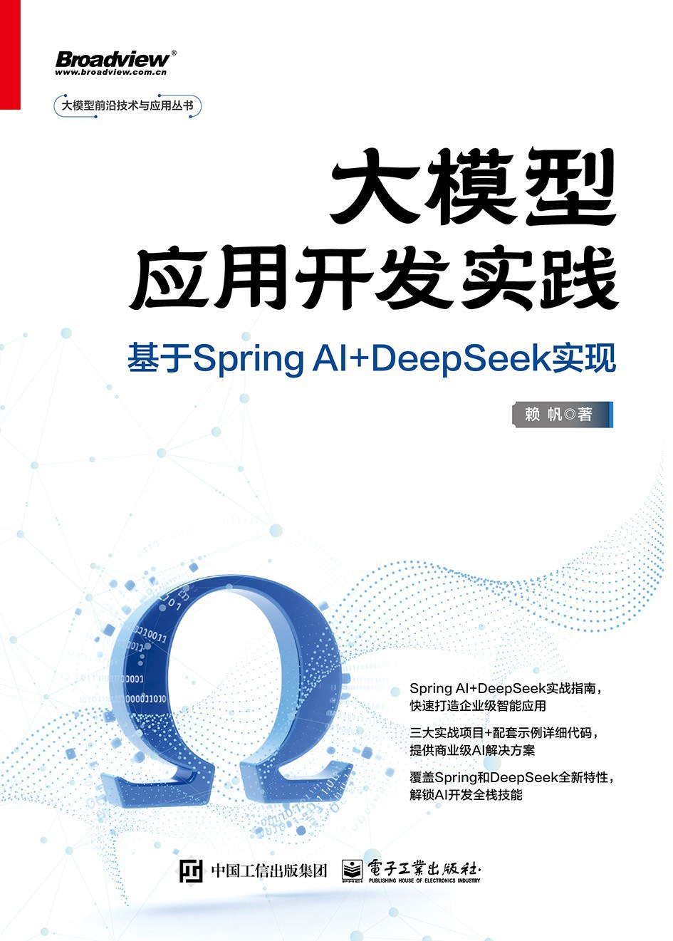 本书是一本全面覆盖Spring6框架、大模型技术以及Spring Al 应用开发技术的开发指南。全书深入浅出地介绍 Spring6框架的特性和应用实践,深入探讨大模型技术和Spring Al的集成应用,涵盖多模态、RAG、Function Calling、嵌入模型、向量数据库、对话记忆和内容审查等知识。全书按照从理论基础到项目实践的顺序编排,首先述Spring的核心原理,如Bean 管理、AOP、数据库编程等关键技术,然后详细介绍 Web 开发,最后延伸到大模型应用开发,以及如何在 Spring 项目中集成和使用DeepSeek等大模型技术。