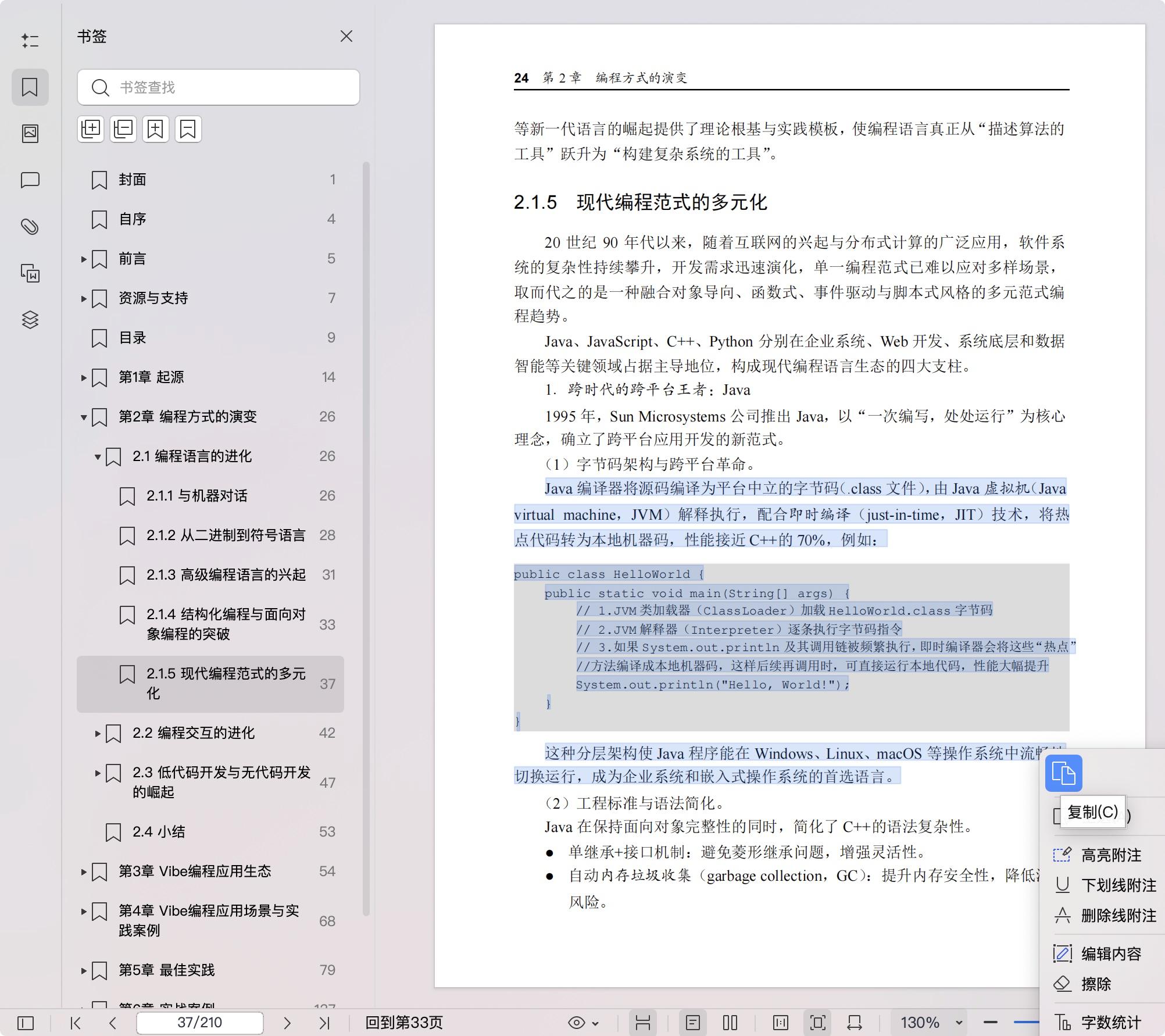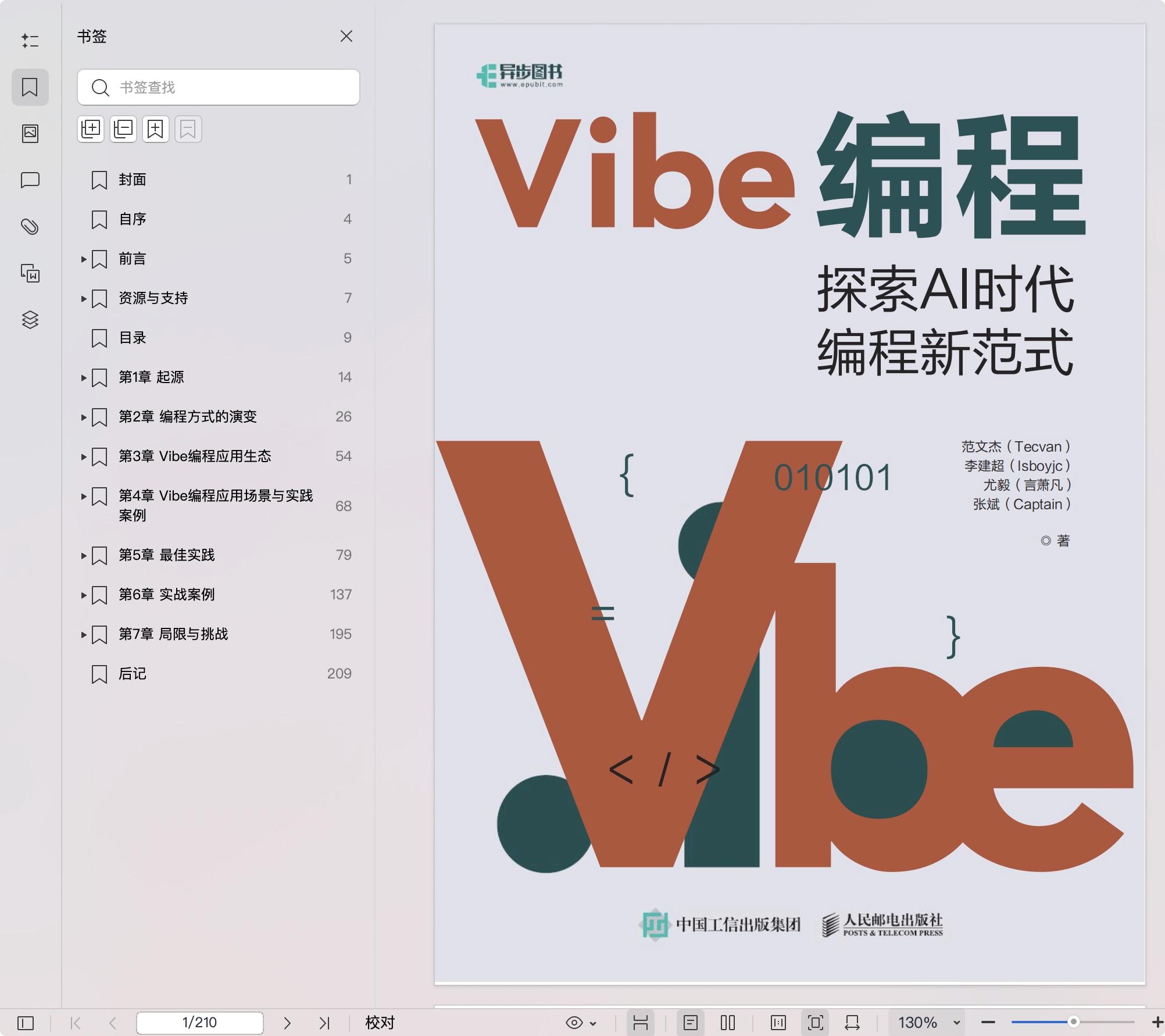 本书深入探讨Vibe编程(也称“氛围编程”)这一新编程范式的技术演进与实践应用。 本书首先解析编程方式从机器指令到高级编程语言的演进脉络,阐明大语言模型如何重塑人机协作模式。然后通过分析通用大语言模型辅助编程、IDE辅助编程与端到端Agent编程这3类应用形态,结合独立开发与企业级案例说明Vibe编程缩短开发周期、降低技术门槛的核心价值。实践部分提供提示词工程技巧、需求规划、代码审查与优化及工程化管理方案,并基于“小红书内容生成器”全栈项目,演示环境配置、项目需求梳理、后端开发、Web端系统开发及应用部署的完整流程,构建对AI友好的工程化体系。最后客观评估当前技术边界,讨论专业开发者能力转型路径与非专业群体的创新机遇。 本书可以帮助专业开发者精进技术架构能力,也可以帮助产品经理、UI/UX设计师及普通用户理解AI编程逻辑并将个人的创意转化成可落地的应用。