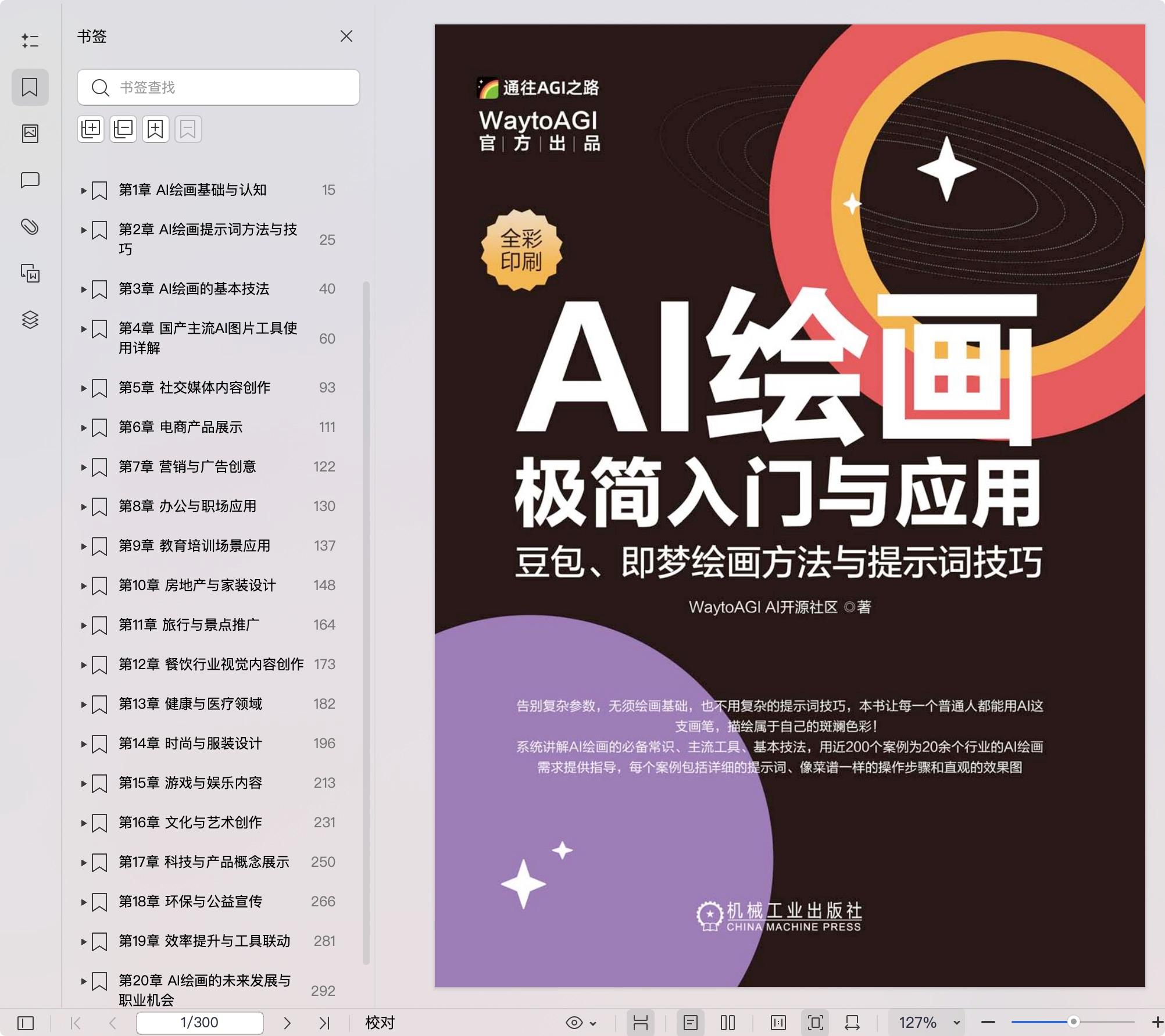 内容简介 无论你从事何种职业,工作和生活中一定经常会用到各种图片素材,当你找不到合适的现成素材,也没有绘画功底,又不会使用Midjourney和Stable Diffusion等复杂的AI绘画工具时怎么办?不要沮丧,这本书不需要你有美学基础,不需要你懂AI绘画工具复杂的参数,也不需要你懂得复杂的提示词技巧,它能教会每一个像你这样的普通人轻松用AI画出自己想要的作品。 本书由在全球拥有900万成员的AI开源社区WaytoAGI(通往AGI之路)官方出品,社区核心共创者亲自执笔。系统且简明扼要地讲解了以下6大方面内容: (1)AI绘画的必备常识,可帮助读者建立对AI绘画的正确认知; (2)即梦、豆包、可图等主流AI绘画工具的使用方法,可帮助读者举一反三,从此成为AI工具使用达人; (3)AI绘画提示词编写与优化技巧,避免了复杂参数和专业美术词汇,彻底铲平了AI绘画的技术门槛; (4)AI绘画的基本技法,包括构图、角色塑造、场景营造、风格表现、分镜、故事构建等,聚焦核心技法,恰到好处,讲解通俗易懂,不深不浅; (5)为电商、营销、广告、办公、教育、旅游、餐饮、健康、医疗等20余个行业和领域高频的AI绘画需求提供手把手指导,具备极大的商业价值; (6)近200个经典的案例,每个案例包括详细的提示词、像菜谱一样的操作步骤和直观的效果对比图,既能按图索骥、一学就会,又能照搬照抄、为己所用。 综合而言,本书还有以下3大特色: 在内容编排上,遵循认知规律,设计了循序渐进的体系化学习路径,引导你从基础概念逐步进阶到高级应用,构建稳固的知识与技能体系。 在实用价值上,不仅确保所有案例贴合实际应用场景,而且融入众多学习者的“踩坑”经验,为你提供宝贵的“避坑”指南,助你少走弯路,提升效率。 在阅读体验上,本书化繁为简、图文并茂,力求将每一个复杂概念和实用技巧讲解得清晰透彻。