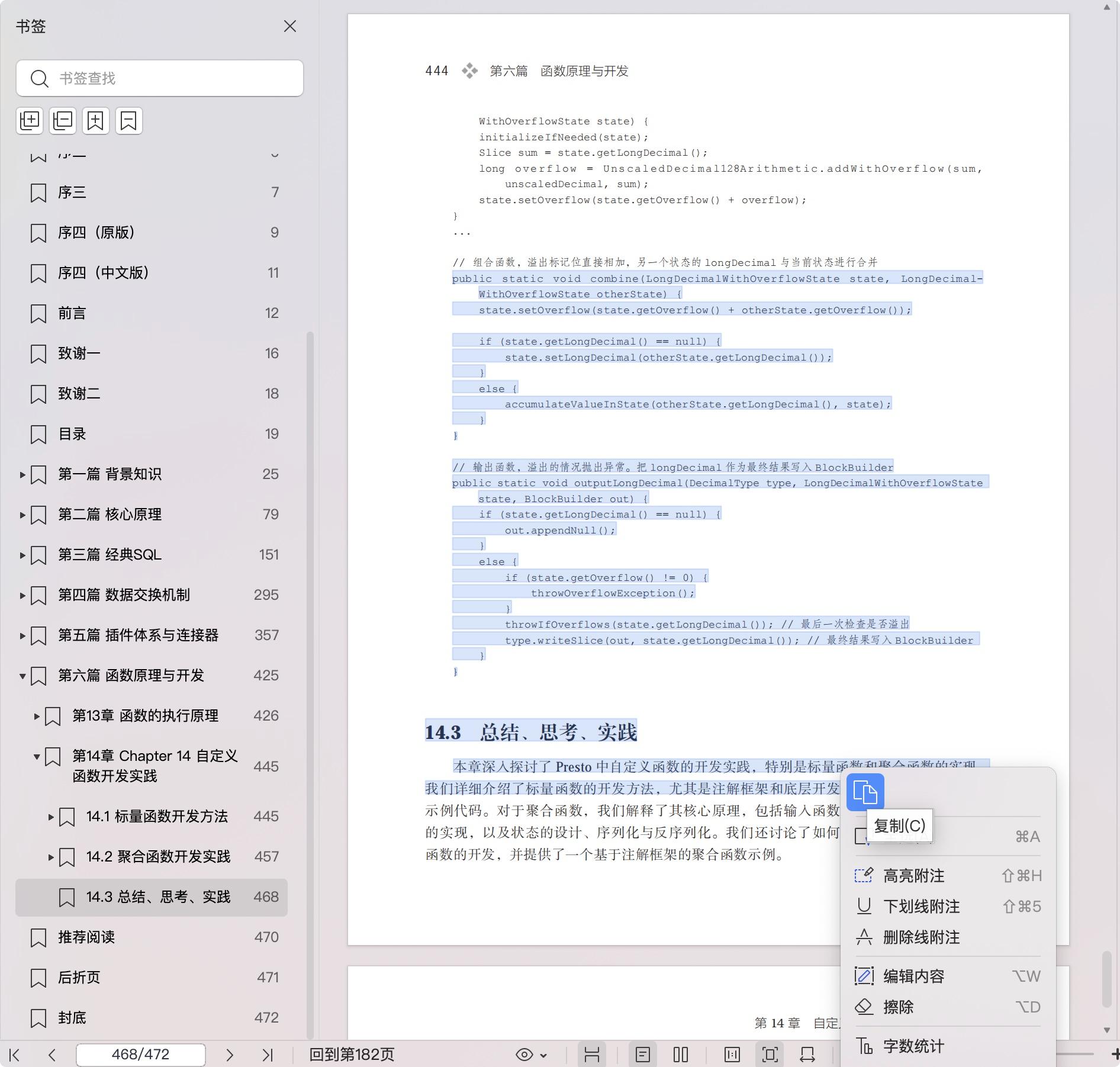 第六篇(13-14章)是函数的设计原理与开发实战,介绍了函数注册、解析识别、调用等重要流程,最后从标量函数、聚合函数两方面入手,用多个实际的案例来介绍高级API(注解框架)的开发方法以及低级API的底层开发方法。
