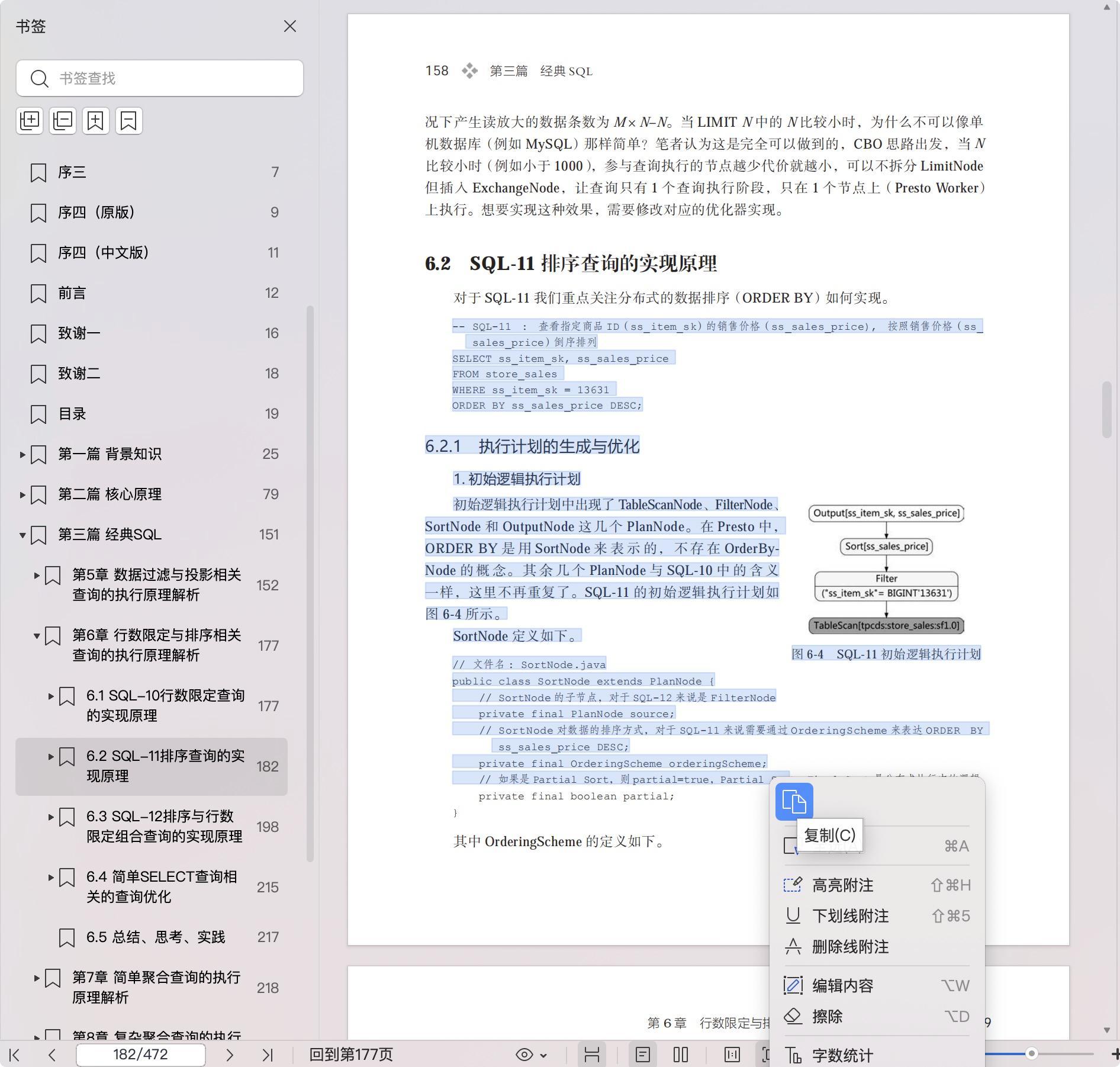 第二篇(3-4章)详细的串讲了查询执行的整个过程,带出了查询解析器、优化器、调度器、执行器几个核心模块的工作原理。