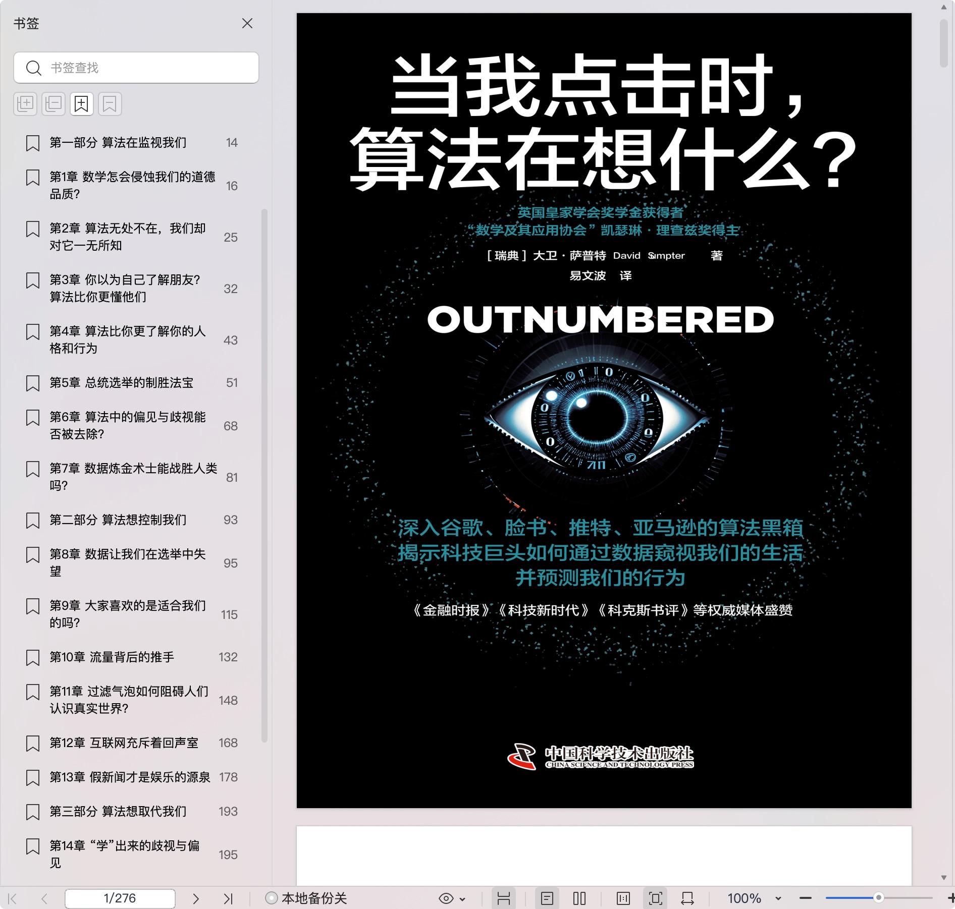 在《当我点击时,算法在想什么?》中,大卫·萨普特带领我们深入算法的神秘腹地。萨普特通过对谷歌、脸书、推特、亚马逊等科技巨头的数据专家的访谈,拆解了这些科技巨头的算法模型,为我们破解了它们的算法黑箱、揭示了数字时代智能产品背后的奥秘。只有理解算法背后的运作逻辑,我们才能摆脱算法的控制,并按我们自己的想法塑造算法以及数字科技。