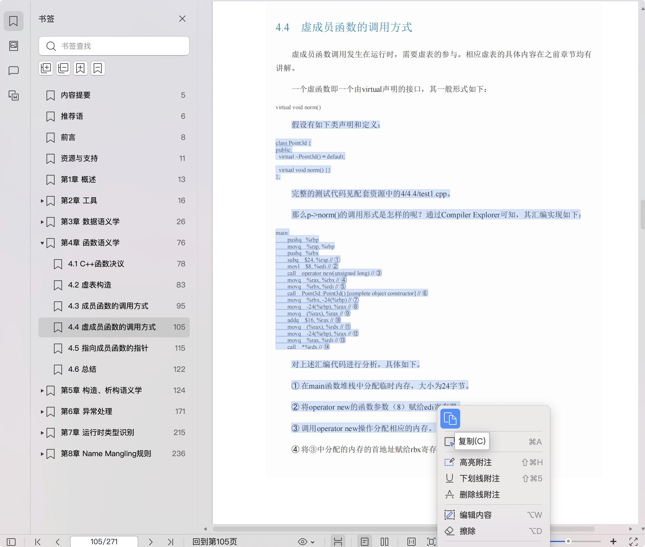 本书先介绍对象模型的基本概念,并引入两个用于研究C++代码实现的开源工具——cppinsights和Compiler Explorer。接着,依次讲解C++数据语义学,即编译器如何布局C++对象模型中的数据成C++函数语义学,包括编译器如何实现C++中的多态、如何调用虚函数等;C++构造、析构语义学,涉及编译器对C++对象的构造和析构方式,包括全局对象和静态局部变量的构造等内容;C++异常处理,包括GCC中异常处理的实现方式及实践准则;C++运行时类型识别(RTTI)的实现原理,包括dynamic_cast算法的具体实现;C++Name Mangling规则,包括GCC对C++代码中各个名称的编码方式。