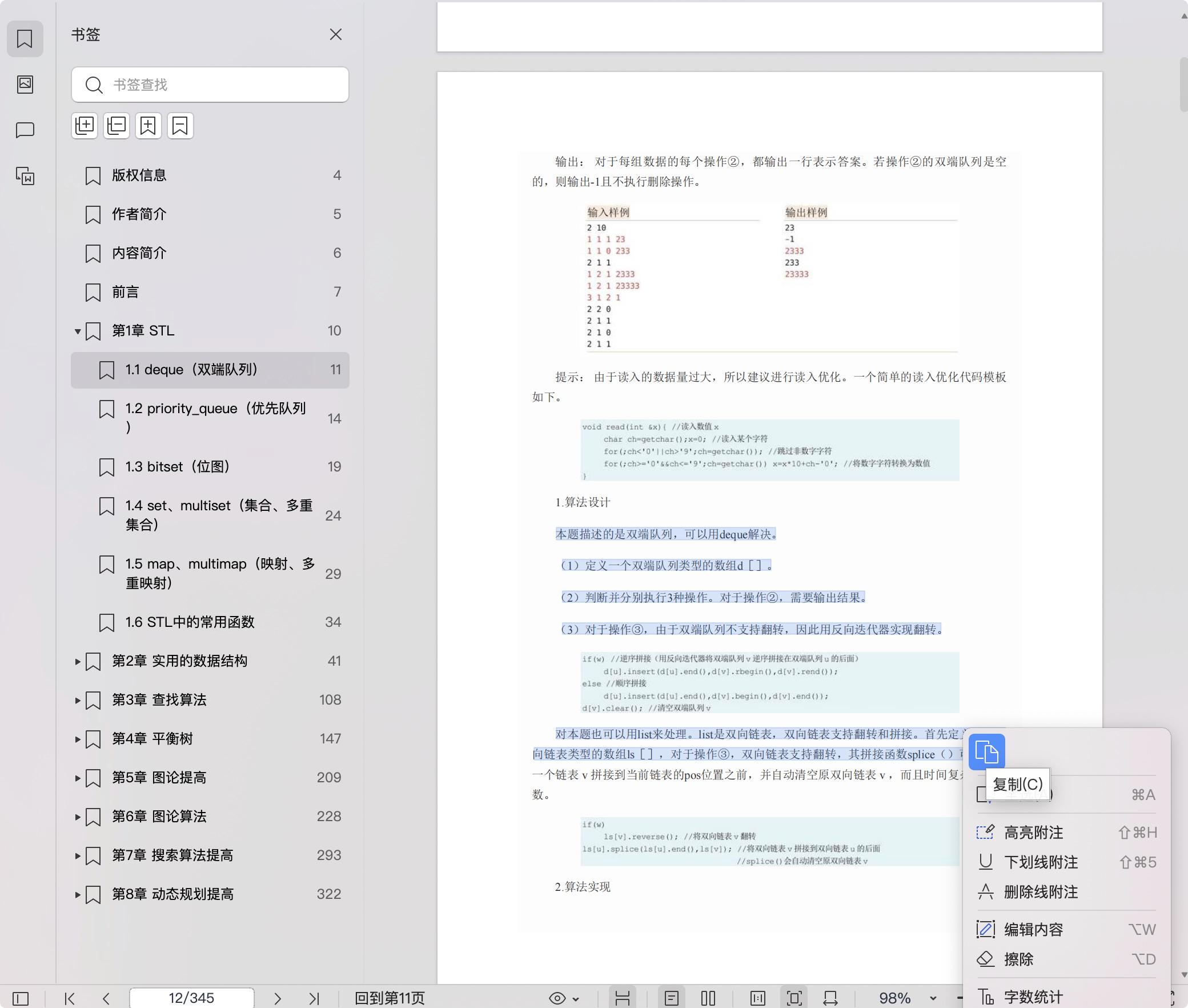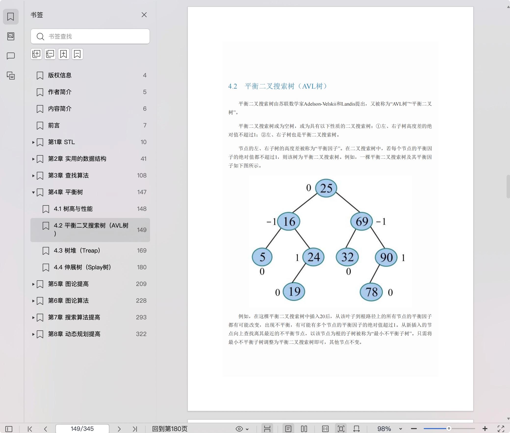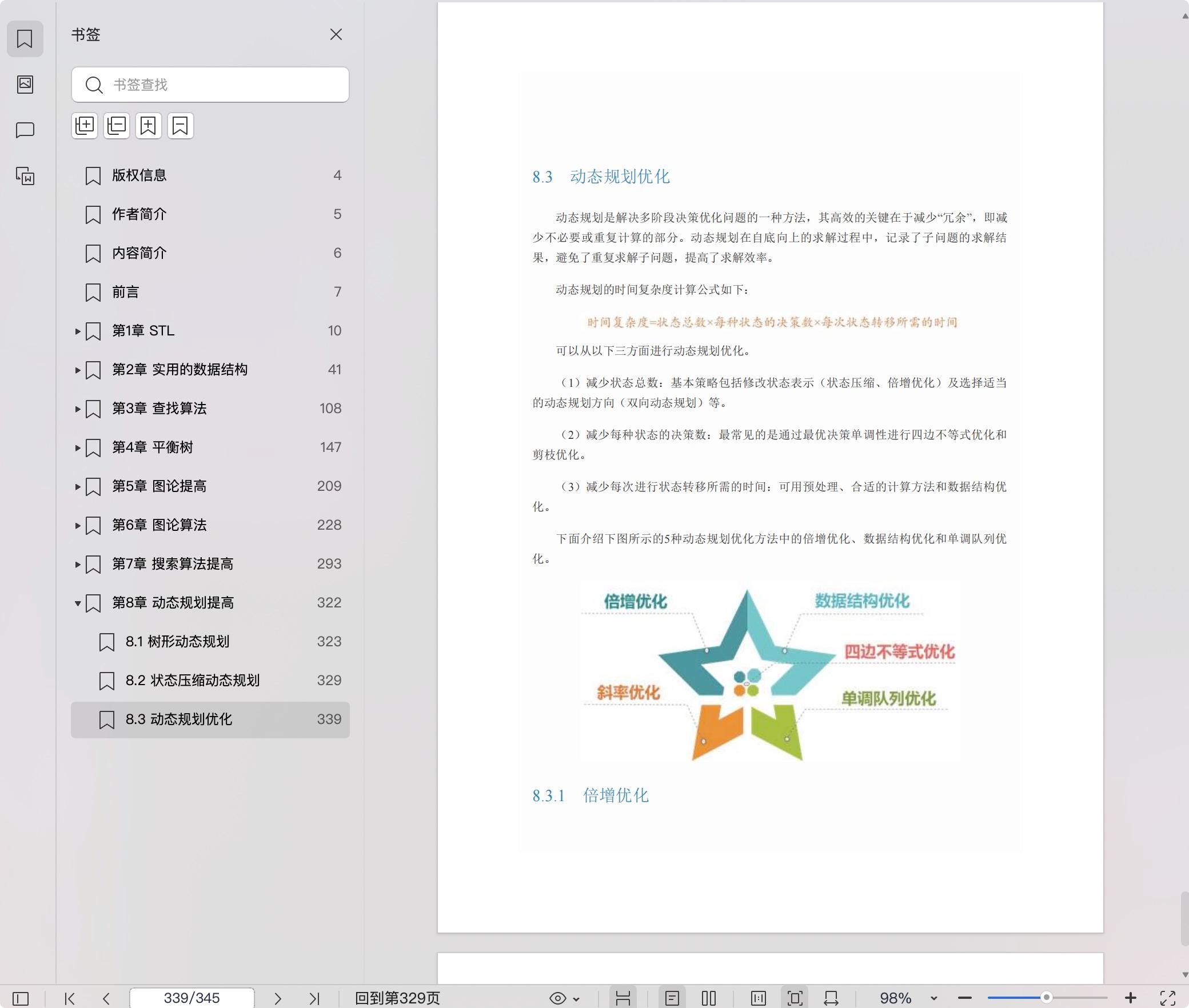 《算法训练营:提高篇(全彩版)》总计8章。第1章讲解STL,涉及双端队列、优先队列、位图、集合、映射和STL中的常用函数;第2章讲解实用的数据结构,涉及并查集、倍增、稀疏表、区间最值查询、最近公共祖先、树状数组和线段树;第3章讲解查找算法,涉及散列表、字符串模式匹配和字典树;第4章讲解平衡树,涉及树高与性能、平衡二叉搜索树、树堆和伸展树;第5章讲解图论提高方面的知识,涉及连通图与强连通图、桥与割点、双连通分量的缩点和Tarjan算法;第6章讲解图论算法,涉及最小生成树、最短路径、拓扑排序和关键路径;第7章讲解搜索算法提高方面的知识,涉及剪枝优化、嵌套广度优先搜索、双向广度优先搜索和启发式搜索;第8章讲解动态规划提高方面的知识,涉及树形动态规划、状态压缩动态规划和动态规划优化。