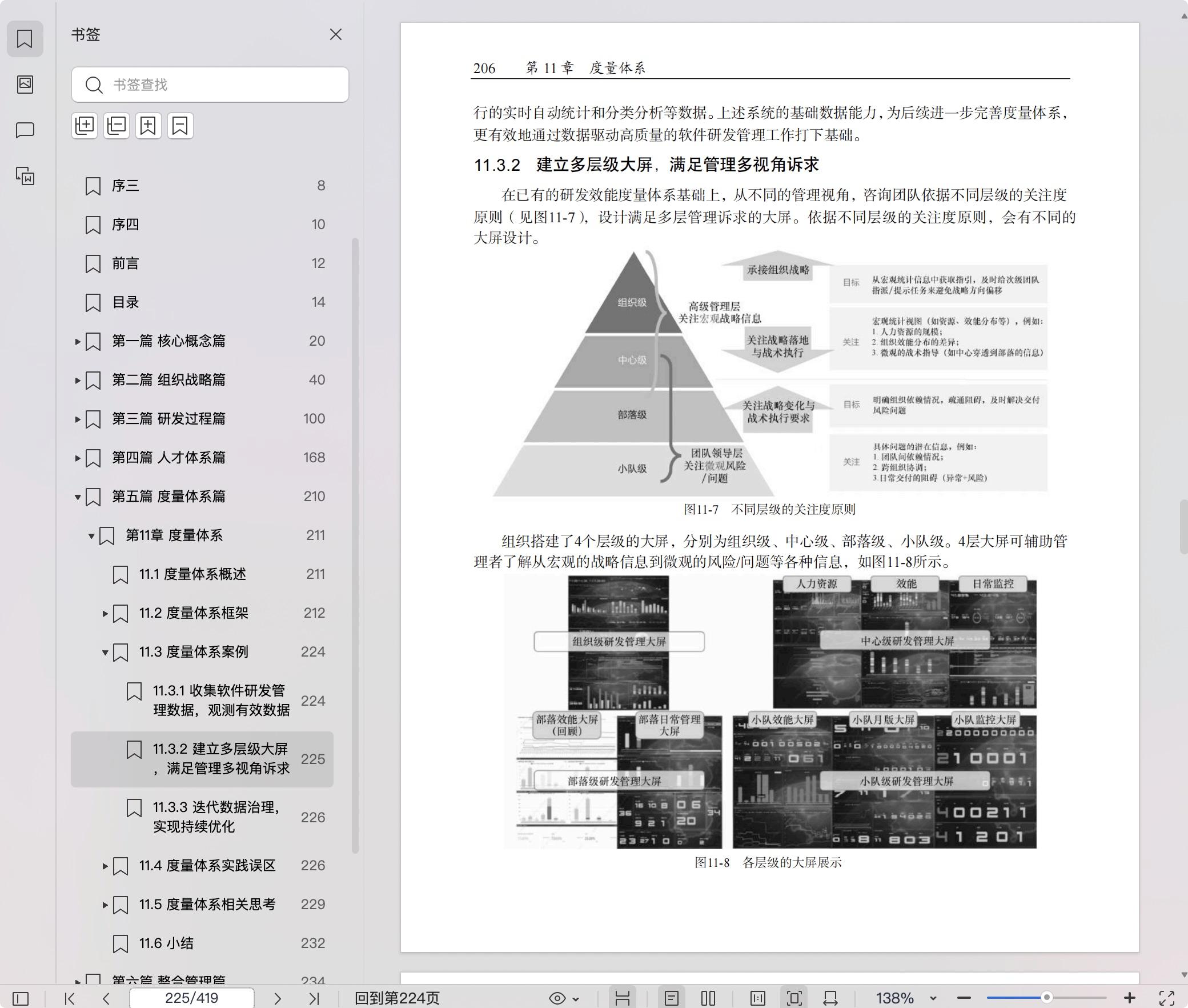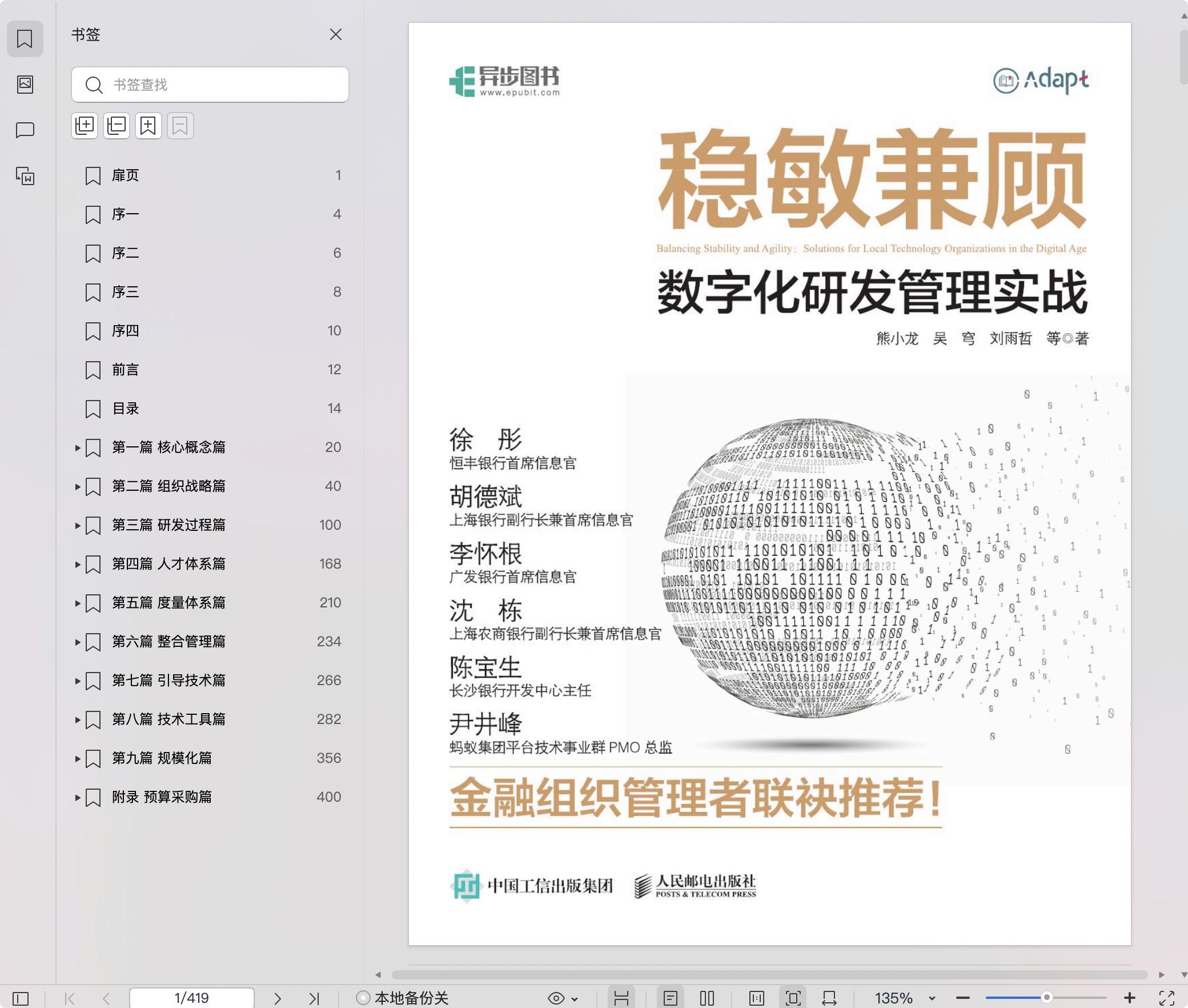 本书探讨软件研发领域数字化管理的策略与实践,涵盖从数字化转型的重要性、实施步骤到效果评估的全过程。本书分9篇,共19章,第一篇介绍为什么转型和核心管理概念,帮助读者寻找问题出在哪里,出路又在哪里;第二篇聚焦组织战略,探索如何构建团队及明确战略定位和目标;第三篇讲解研发过程,强调需求层级体系、产品研发过程和团队协作;第四篇讨论人才体系,聚焦如何做到把工作目标和能力提升相结合,提供测试行会和效能行会的建设和运营;第五篇介绍度量体系,既有“多”“快”“好”“赞”的体系,又有案例、实践误区、深入思考点;第六篇谈到整合管理,从敏捷项目管理与版本火车的视角,串联完整的研发过程管理;第七篇从引导技术的视角帮助转型者清扫转型中的障碍,让转型在组织中传播更容易,效果更理想;第八篇介绍硬核技术,帮助读者在技术上做好基本功,为软件研发保驾护航;第九篇提供方法论指导和案例参考,帮助读者构建自己的规模化转型路径。
